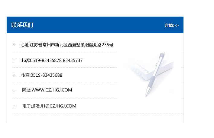 地址:常州市新北區友邦商務大廈1幢16、17層  電話:0519-85101652  傳真:0519-85112595  郵編:213022  網址:www_cz-jiayue_cn.31yes.com  郵箱:xiajifengaa@163.com